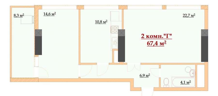 14 этаж – 2 комнатная квартира (67,4 м2)