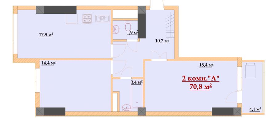3 этаж – 2 комнатная квартира (70,8 м2)